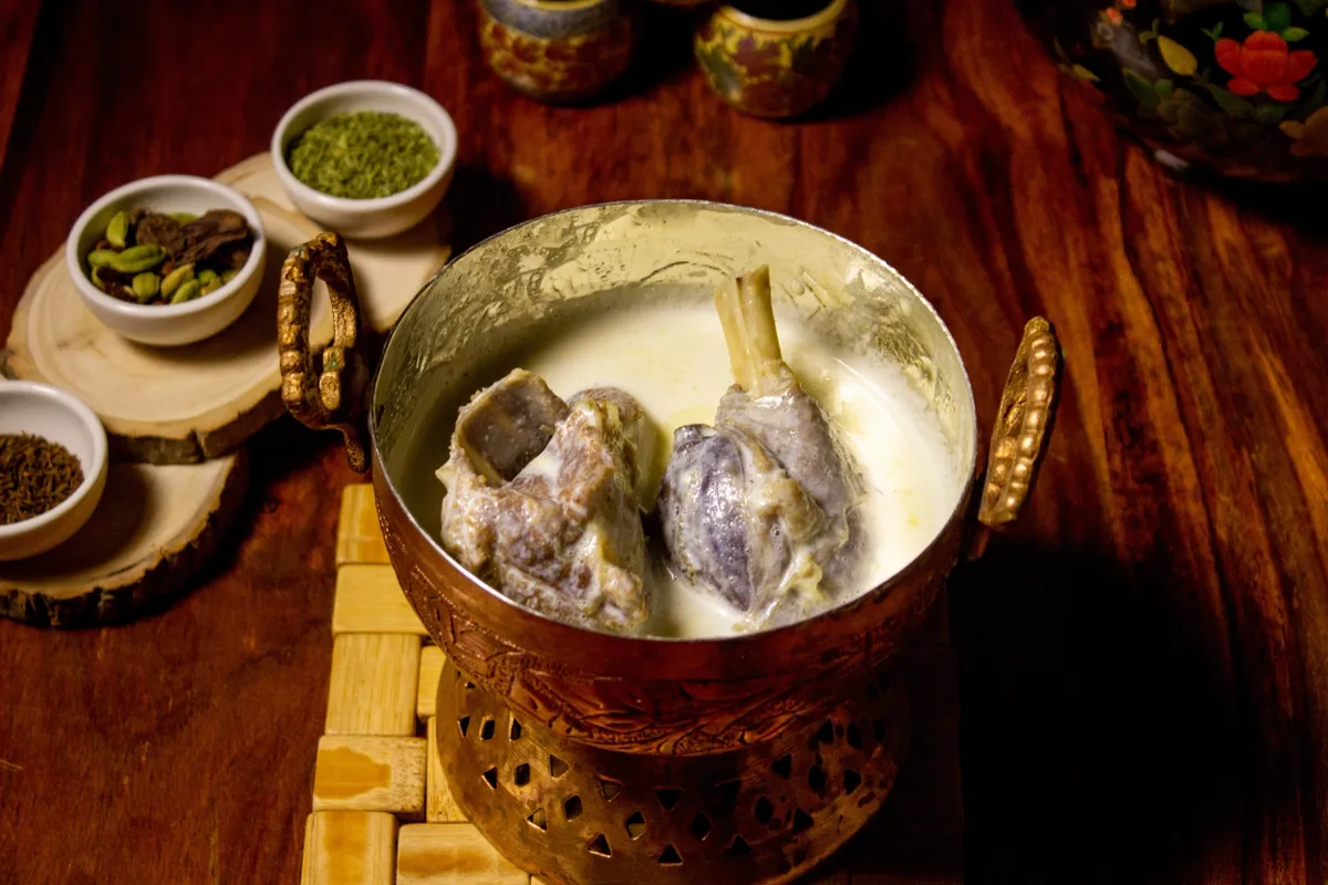 Lamb cooked in milk and fennel gravy with a tinge of sweetness. Served with rice and Kashmiri condiments.