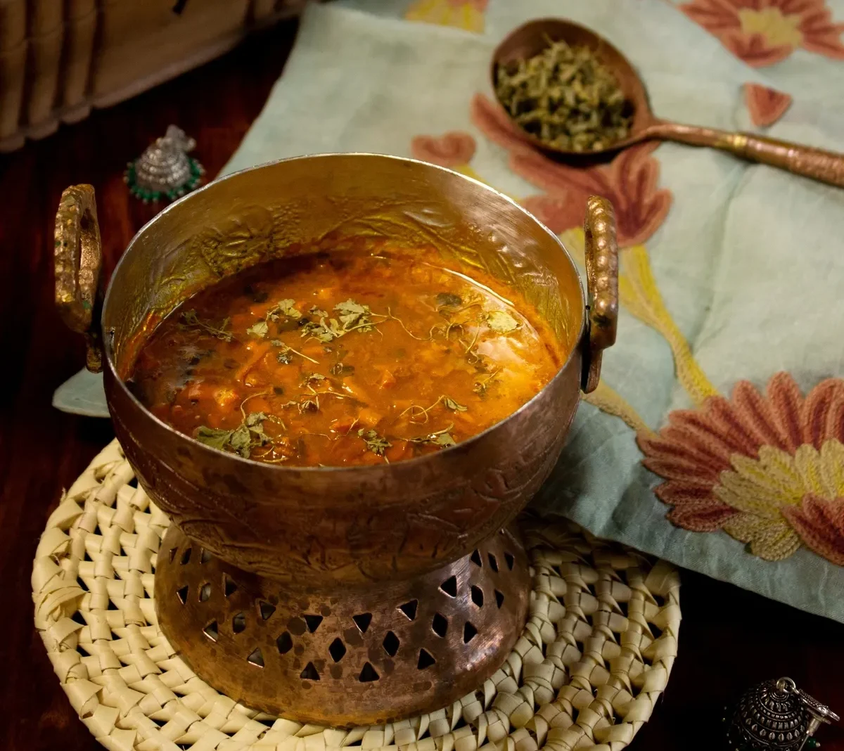 Small chunks of mixed meat cooked in mutton stock with traditional Kashmiri spices and finished with a dash of fenugreek. Served with rice and Kashmiri condiments.