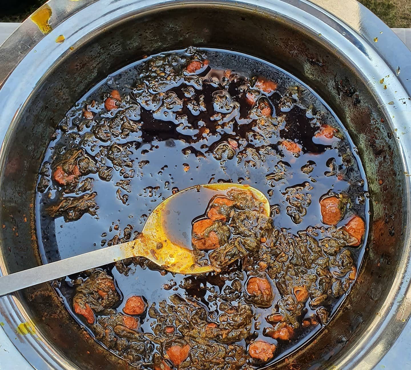 Spinach cooked with small meatballs. Served with rice and Kashmiri condiments.