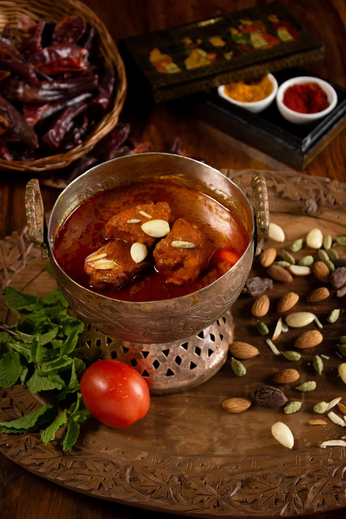 Cottage cheese simmered with red tomato gravy and finished with Kashmiri herbs. Served with rice and Kashmiri condiments.